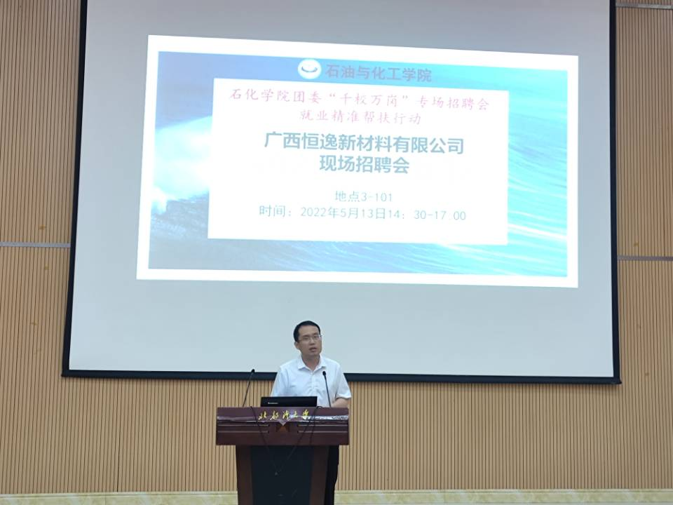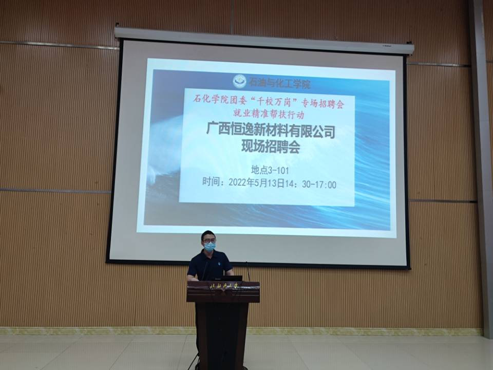2022年5月13日,石化学院团委开展“千校万岗”专场招聘会就业精准帮扶行动,邀请广西恒逸新材料有限公司来我院进行专场宣讲招聘会。会议在3栋101报告厅召开,广西恒逸新材料有限公司负责人王铁铭、唐小薇、莫贤娣、翁昊天、湛亚、陈锦周、黄静,我院院长尹艳镇,党委副书记粟建勇,学工办主任、团委书记李雅琴,辅导员周旭老师、辅导员陈海锋老师以及我院2022届毕业生参加了本次招聘会。