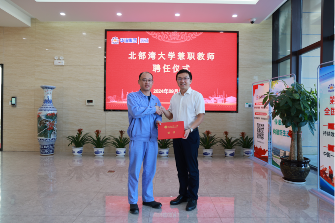 校党委副书记陈磊(右一)为广西华谊氯碱党总支书记、项目经理、上海氯碱总工崔巍(左一)颁发我校兼职教师、硕士研究生行业导师聘书