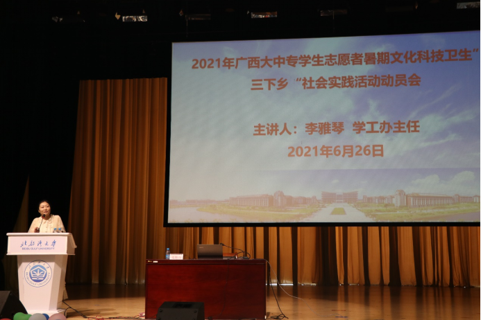 最后,召开2021年广西大中专学生志愿者暑期文化科技卫生“三下乡”社会实践活动动员会,由学生工作办公室主任、分团委书记李雅琴老师主讲。她从“志愿者”“暑期”“三下乡”“社会实践”几个关键词出发,向在场的师生介绍了“三下乡”社会实践活动的意义、项目申报条件和思路、关键时间节点等相关情况,鼓励辅导员、班主任加强班团建设,动员同学们积极申报暑期“三下乡”社会实践活动,在社会实践中感悟党史学习教育红色精神和乡村振兴,增强爱国爱党之情。