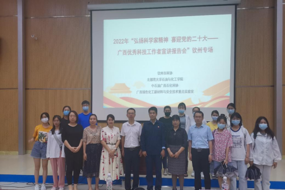 2022年钦州市第一届“最美科技工作者”获得者中国石油广西石化公司处长陈保华、钦州市科学技术协会副主席周路、钦州市科学技术协会与青少部部长徐敏、北部湾大学石油与化工学院党委书记黄瑜、院长尹艳镇、副院长张艳军、石油与化工学院部分教师及学生代表参加宣讲会。会议由科技处副处长、学校科协秘书长劳燕玲主持。