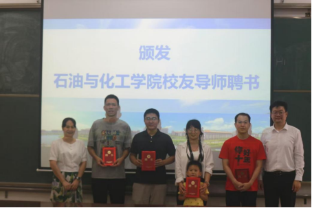 校友们先参观了我院实验室。座谈会上副校长尹艳镇发表了感言,欢迎校友回家。党委书记黄瑜做了致辞。院长史忠丰介绍了我校及我院发展成果以及未来规划等。接着颁发“石油与化工学院2011级校友奖学金”,款项全部由校友捐赠,旨在表彰今年17名学子顺利考取研究生。为凝聚校友力量,现场颁发了“石油与化工学院校友导师聘书”。