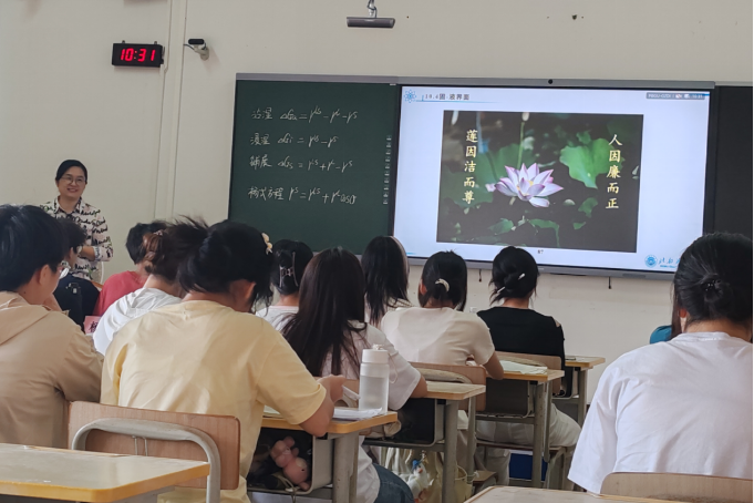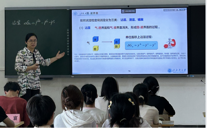 公开课上,王爱荣老师以诗歌导入课程,用物理化学原理解释诗歌中的现象,巧妙激发学生学习兴趣。王爱荣老师采用问题启发式教学,引导学生深入思考“吉布斯函数变为什么等于界面张力变”、“杨氏方程为何无法确定铺展过程接触角的大小”等核心问题。在探究式教学环节,学生分组合作,通过计算接触角分析润湿过程的吉布斯函数变,强化理论与实践结合能力。此外,课程还结合学院教师的高水平科研论文,解析吸附等温式在材料表征中的应用,帮助学生掌握实验设计与性能分析方法,提升科研思维。
