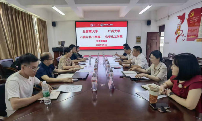 2025年6月6日下午,北部湾大学石油与化工学院党委委员、副院长张艳军,广西绿色化工新材料与安全技术重点实验室副主任张斌斌,工程研究中心副主任蔡平雄,骨干老师张子琳、谢元健一行赴广西大学化学化工学院交流学习。本次会议在广西大学化学化工学院三号楼217会议室举行,广西大学化学化工学院副院长尹诗斌、院长助理潘远凤等领导及重点实验室负责人童张法教授等参与交流。