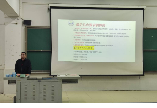 党委副书记粟建勇做总结讲话,他强调春节是平安团圆的节日,要把安全放在第一位,每位同学都做好自身安全,随时保持与家人老师的联系,知原由,知同伴,知去向;要遵守学校规章制度,遵守实验室安全管理规定;要遵守网络文明行为规定,养成文明习惯;要严于律己遵守道德和法律的底线,不违背社会公序良俗。最后希望同学们放假不放学,多参加社会实践和就业实习实训,度过一个平安、丰富且充实寒假。